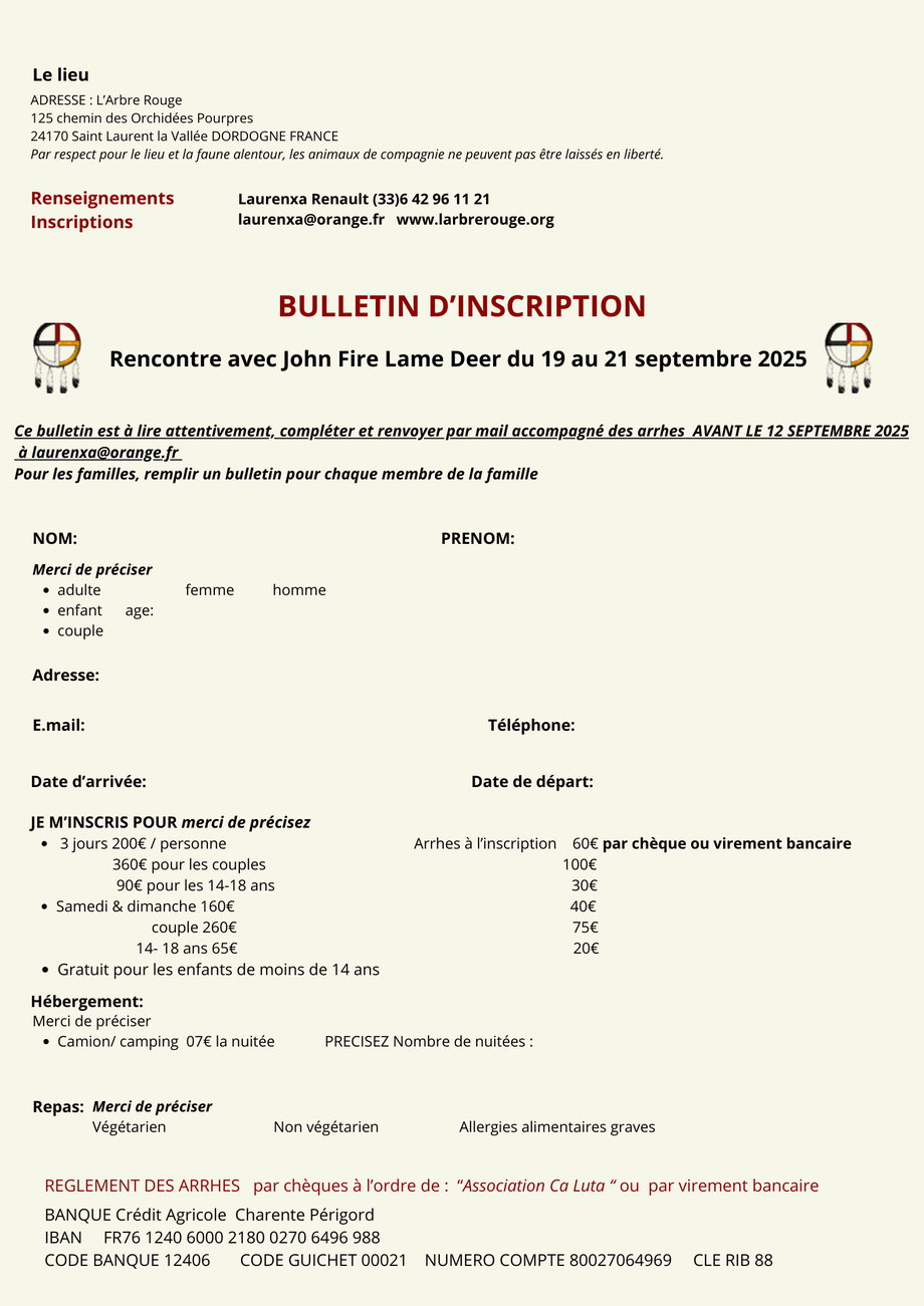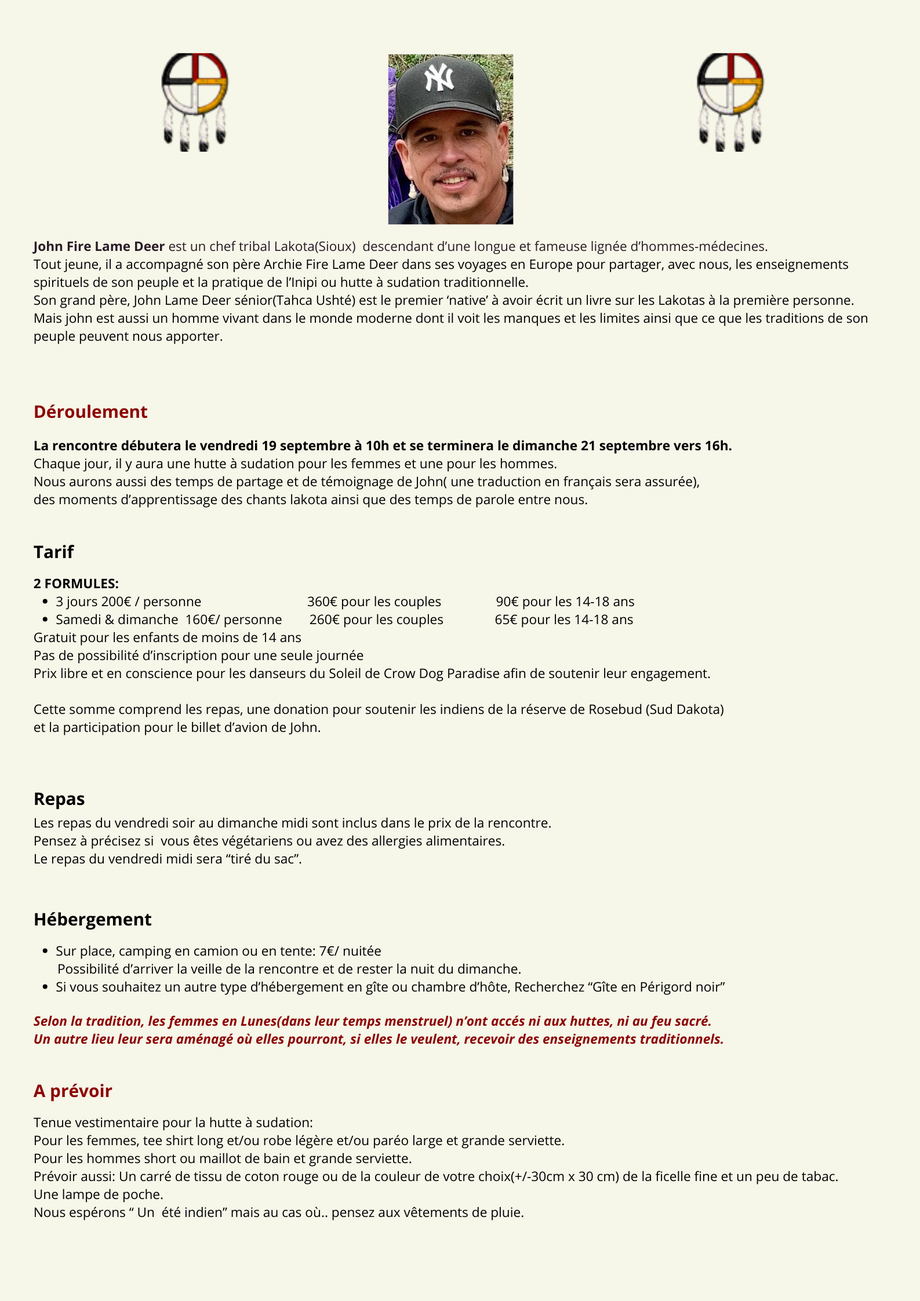 Vous serez accueillis par Laurenxa Renault, gardienne du lieu et par Bernard Legrand, tout deux Danseurs du Soleil à la réserve de Rosebud, Sud Dakota.